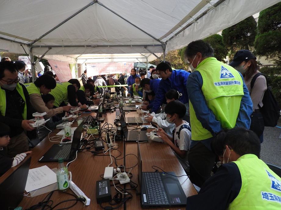 11月14日(金)県民の日県庁オープンデーに、埼測協ブースを出展しました。県庁を訪れた多くの子供たちや保護者の方々に測量の楽しさを体験していただきました。「ドローンシュミレーター体験!」では、自分でパソコン画面を見ながらドローンを操縦してもらい、「測量体験歩いて距離を測ってみよう!」では、実際に自分で歩いて(歩幅で)距離測り、実際の距離との比較により精度を確認し、測量の楽しさを感じてもらいました。ブースには約920名の方が訪れ大盛況でした。