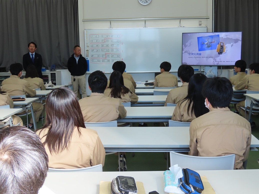 当協会経営委員会で12月1日(月)に県立いずみ高等学校で環境建設科の学生35人を対象に測量体験授業を行いました。1時限目は屋外でドローン測量と地上レーザ・ライダー測量の体験をしていただき、2時限目は教室で三次元データ測量の概要とデータの活用方法について説明を行いました。また、将来の進路先として測量設計業を意識してもらえるように当協会で作成したPR動画を見てもらいました。