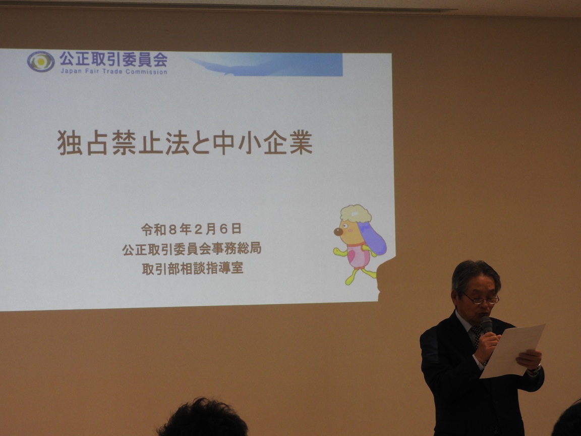2月6日、さいたま市のプラザウエストにおいて、3団体(日本補償コンサルタント協会関東支部埼玉県部会、埼玉建設コンサルタント技術研修協会、埼玉県測量設計業協会)合同で、独占禁止法の研修会を開催しました。当日は公正取引委員会事務総局の方に講師をお願いし、95名の参加により、「独占禁止法と中小企業」をテーマに、「独占禁止法の概要、事業者団体ガイドライン、違反行為に対する措置、中小企業関連情報、相談窓口」等について、具体例をもとに分かりやすい説明をいただきました。