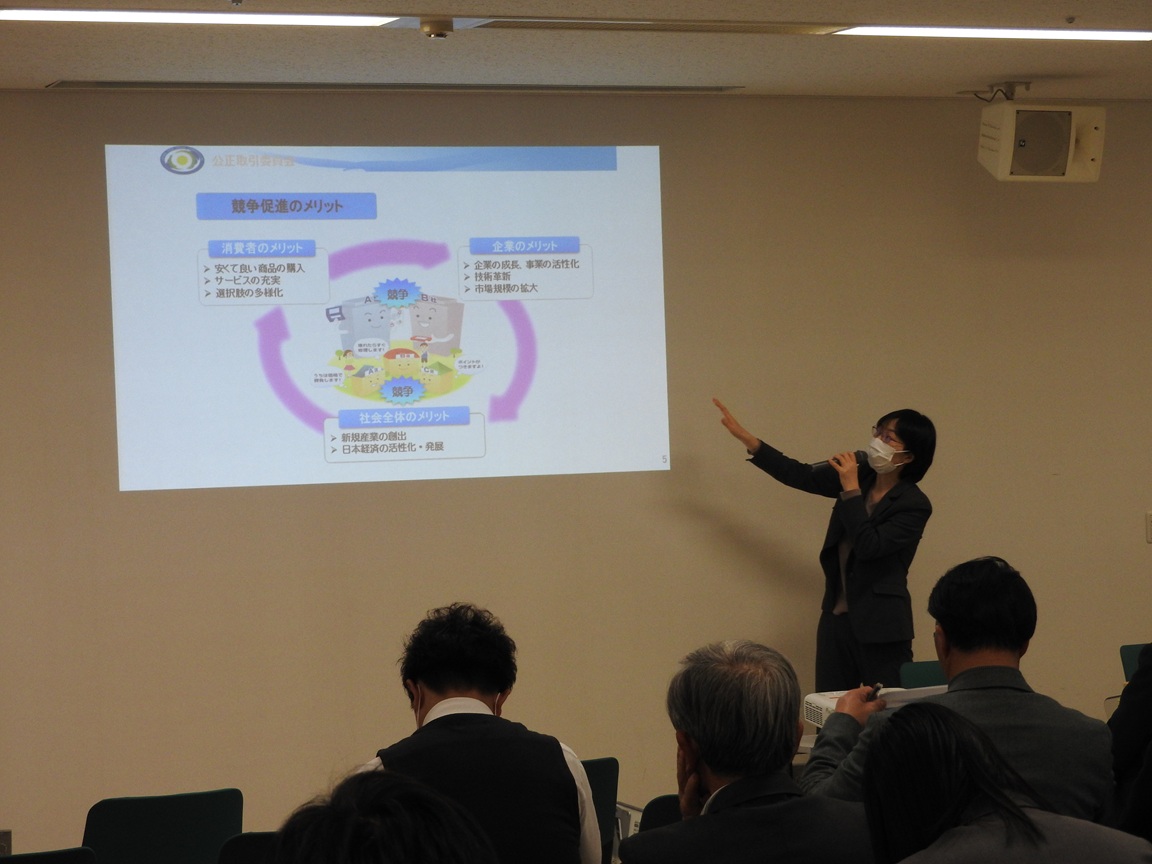 2月6日、さいたま市のプラザウエストにおいて、3団体(日本補償コンサルタント協会関東支部埼玉県部会、埼玉建設コンサルタント技術研修協会、埼玉県測量設計業協会)合同で、独占禁止法の研修会を開催しました。当日は公正取引委員会事務総局の方に講師をお願いし、95名の参加により、「独占禁止法と中小企業」をテーマに、「独占禁止法の概要、事業者団体ガイドライン、違反行為に対する措置、中小企業関連情報、相談窓口」等について、具体例をもとに分かりやすい説明をいただきました。